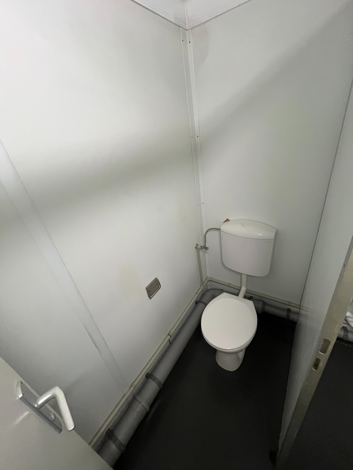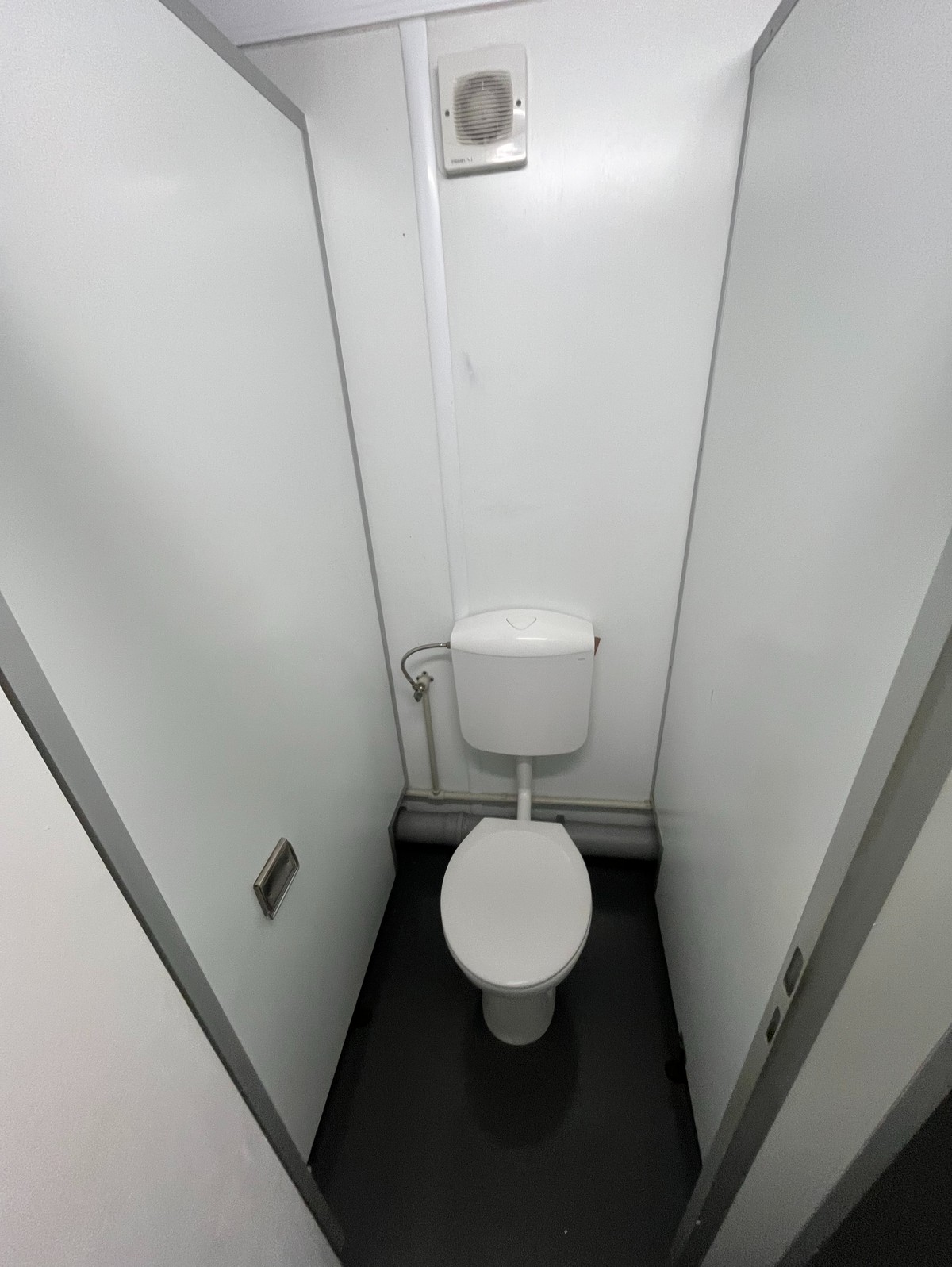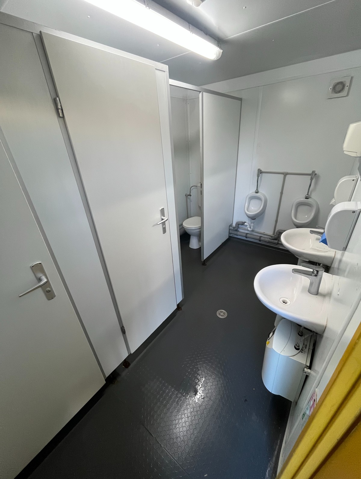 Used modular 3+1 toilet block cabin split 80% large cubicle/urinal block and 20% separate toilet room.Hook up 230v supply externally.